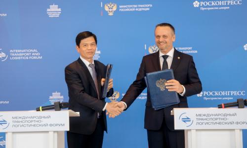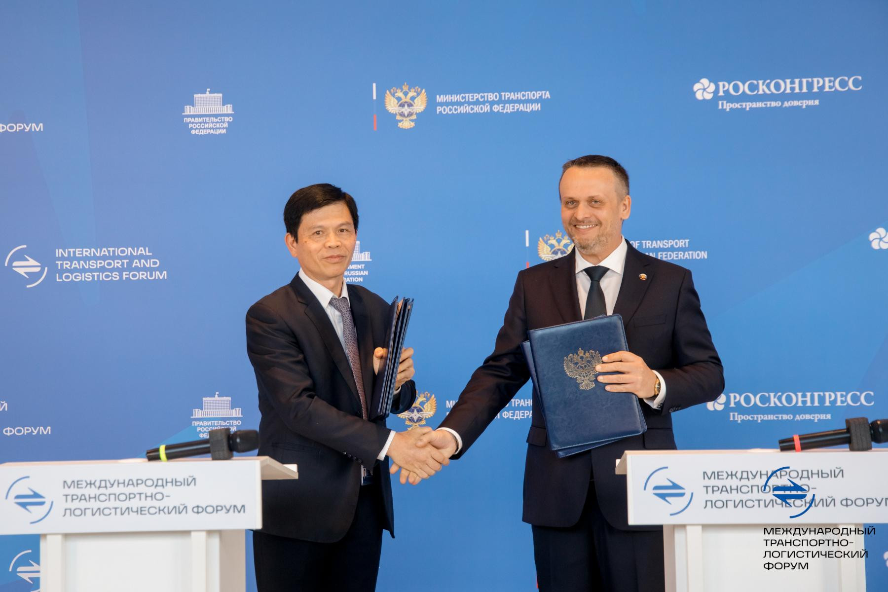 Министр транспорта Российской Федерации Андрей Никитин и заместитель Министра строительства Социалистической Республики Вьетнам Ле Ань Туан на Международном транспортной-логистическом форуме подписали Протокол о внесении изменений в Соглашение между Правительством Российской Федерации и Правительством Социалистической Республики Вьетнам о морском торговом судоходстве от 27 мая 1993 года.