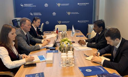 Т.Р. Мидхун проинформировал о направлениях работы ШОС и мероприятиях в преддверии 25-летнего юбилея организации, высоко оценив усилия российской стороны по организации форума и отметив российские инициативы на транспортном треке ШОС.