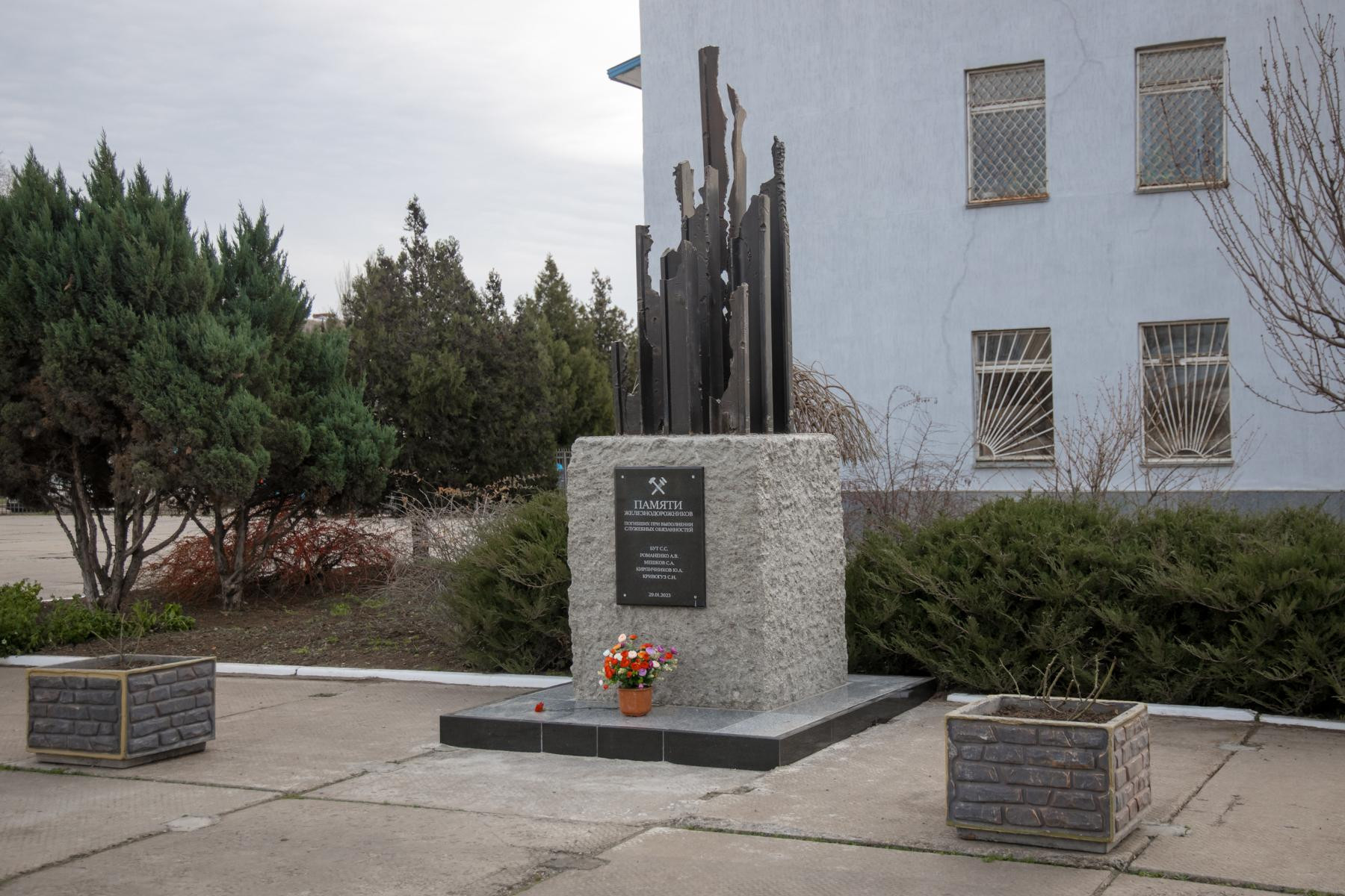 Памятник выполнен из рельсов, а постамент памятника из щебня, которые были взяты с места трагедии.
