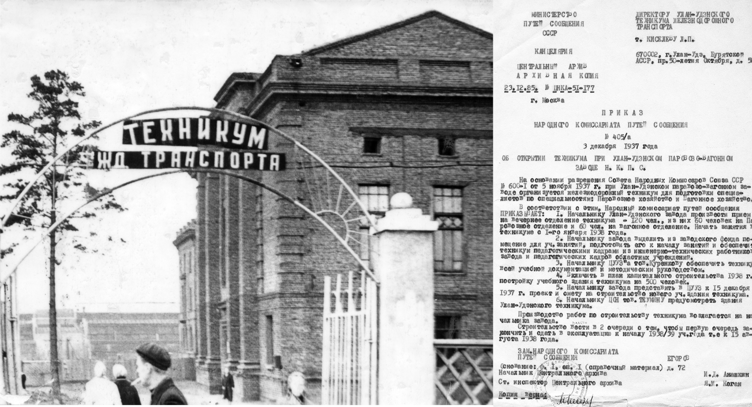Первое техническое учебное заведение Республики Бурятия – Улан-Удэнский колледж железнодорожного транспорта ведет отсчет своей истории с 3 декабря 1937 г. Тогда в соответствии с приказом Народного Комиссариата путей сообщения от 3 декабря 1937 г. № 405/а на основании разрешения Совнаркома СССР в Улан-Удэ был открыт механический техникум железнодорожного транспорта с двумя специальностями: Вагонное хозяйство и Паровозное хозяйство. Техникум появился на свет как спутник индустриального гиганта Бурятии и Восточной Сибири Улан-Удэнского Паровозо-вагонного завода. Тогда же началось строительство учебного корпуса, первая очередь которого была сдана в 1939 году.