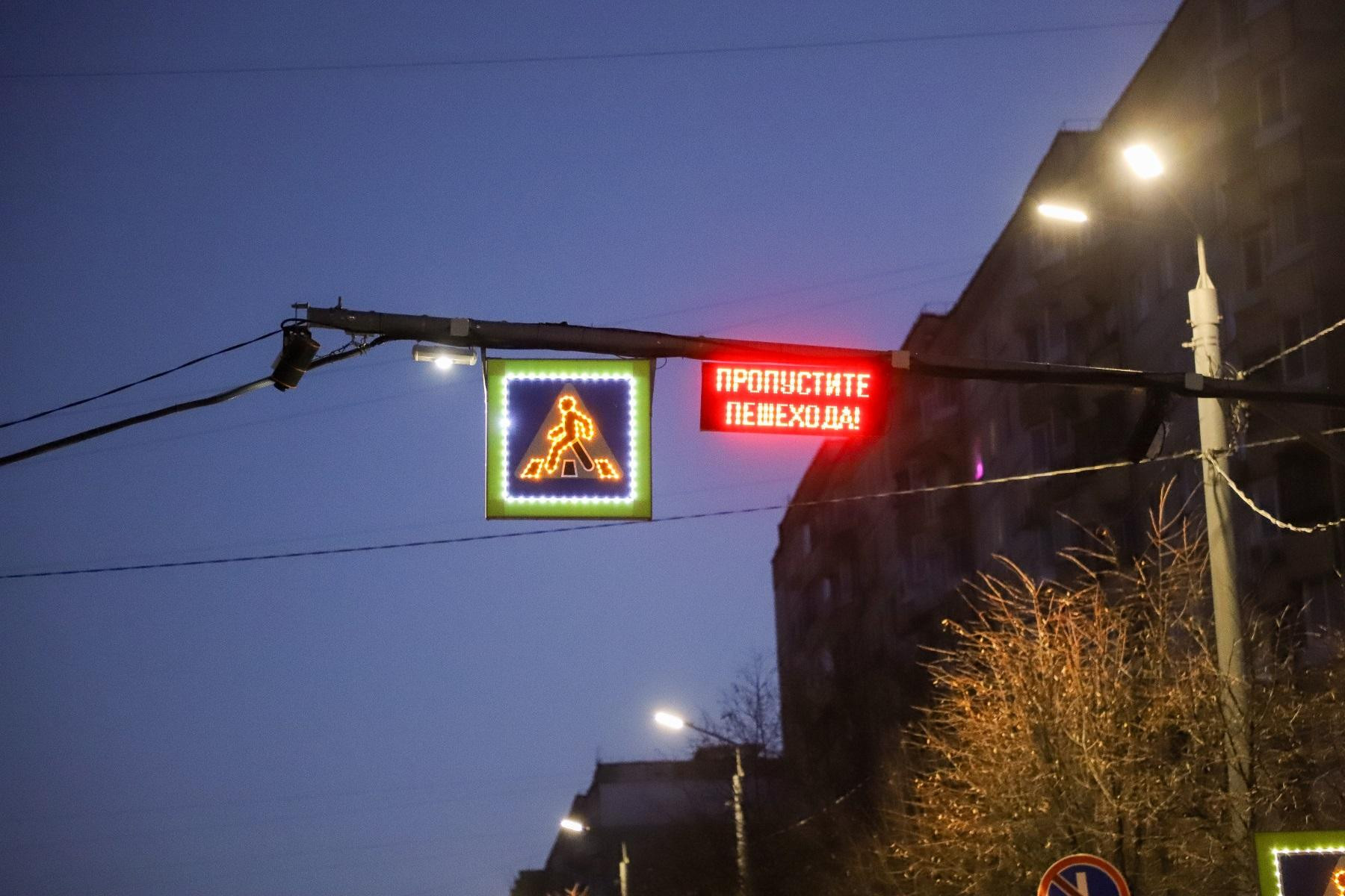 Пешеходные переходы оборудуют П-образными опорами с проекторами, которые отражают бело-желтую разметку на проезжую часть. Световая разметка не заменяет существующую, а дублирует ее в темное время суток – такая зебра заметна за 100 – 150 м, и дает водителю возможность вовремя заметить переходящих дорогу людей.