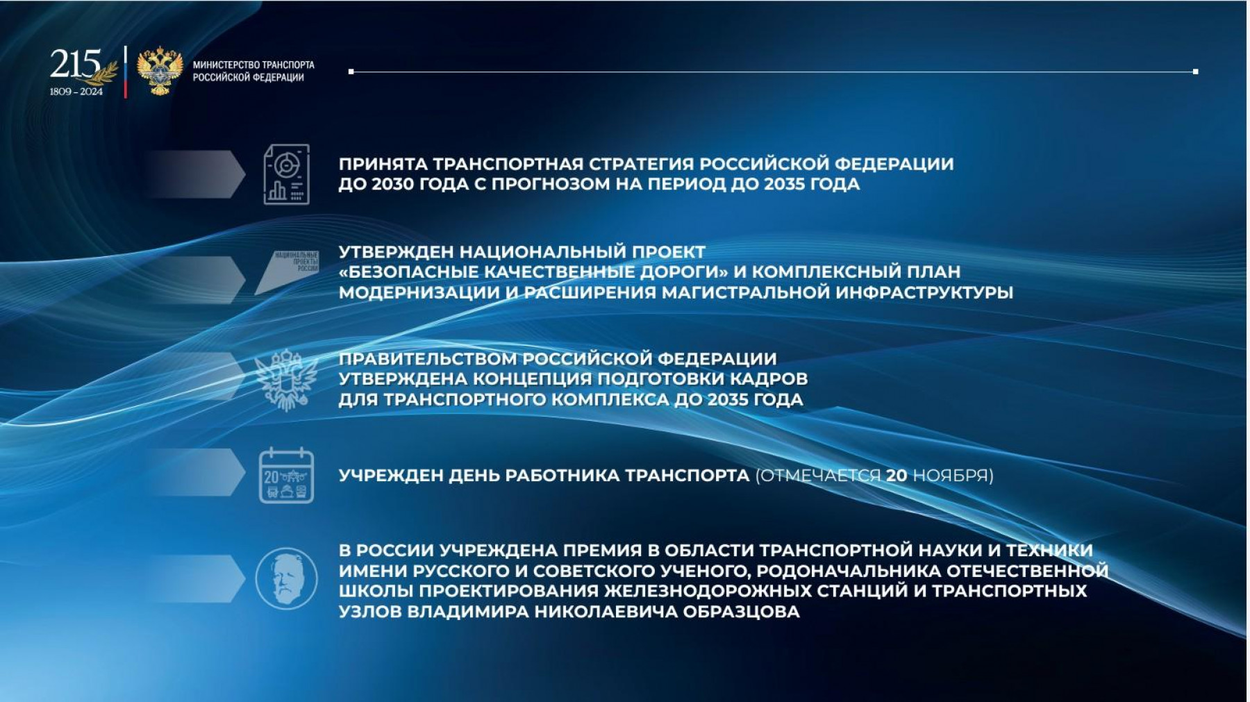 За последние годы транспортный комплекс России кардинальным образом преобразился. При этом важнейшими задачами Минтранса остаются: обеспечение транспортной доступности российских регионов, рост мобильности населения, безопасность и комфорт пассажиров, налаживание и поддержание устойчивых логистических цепочек.