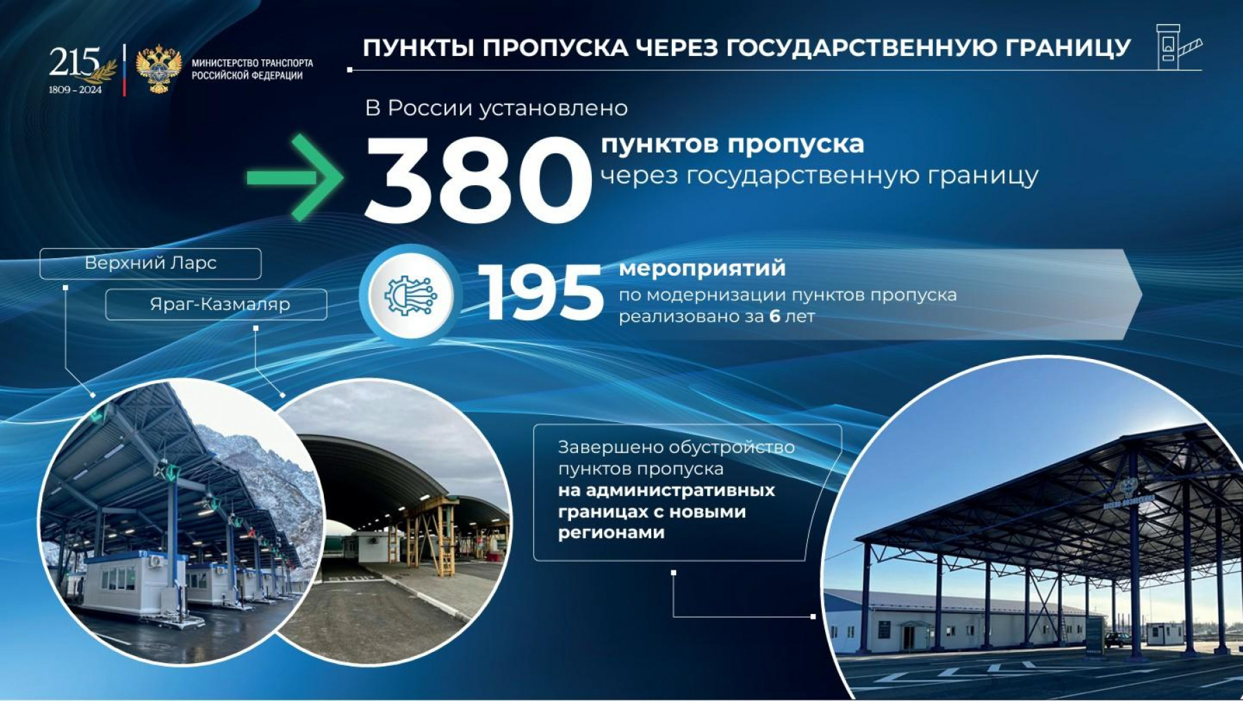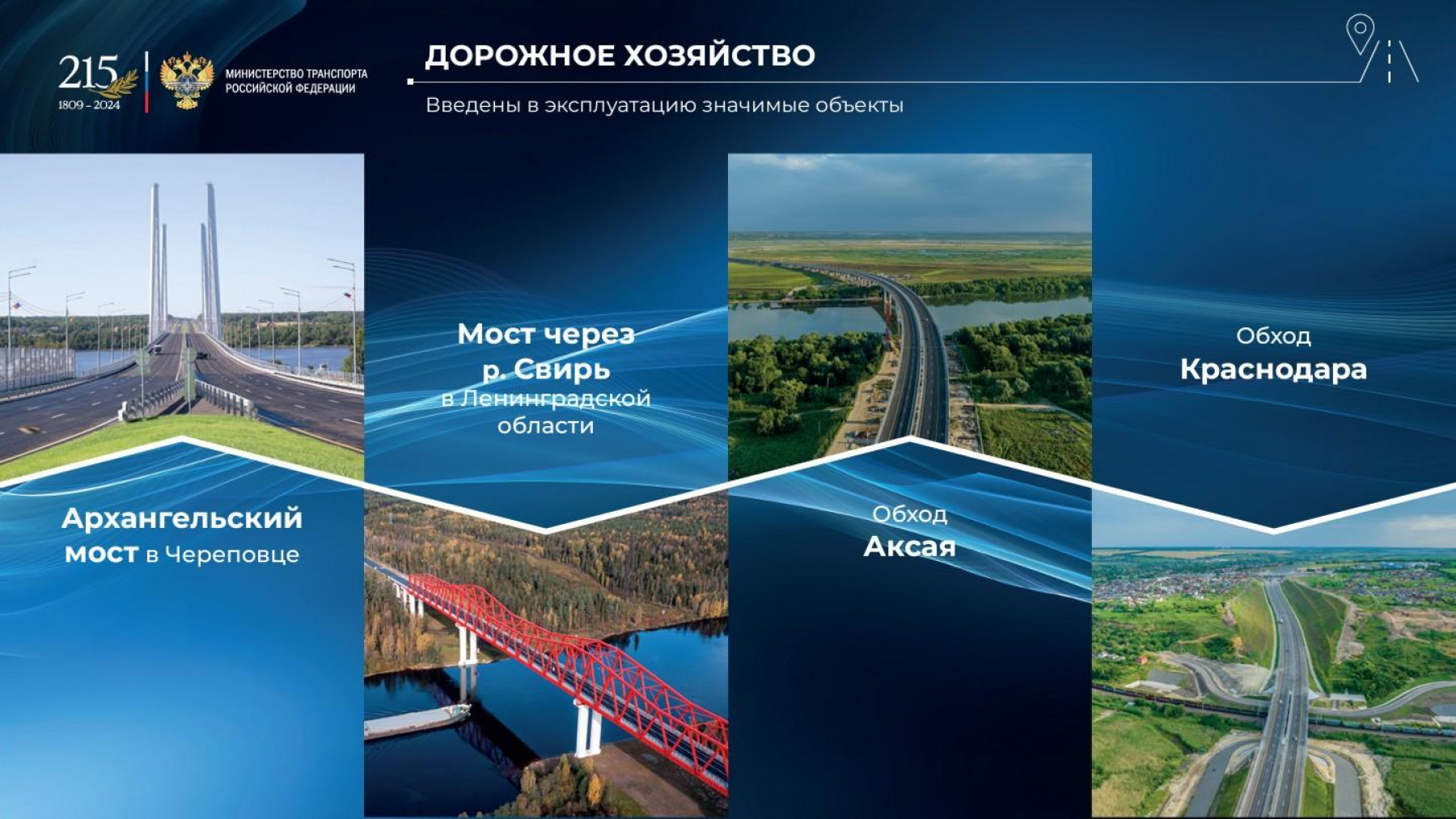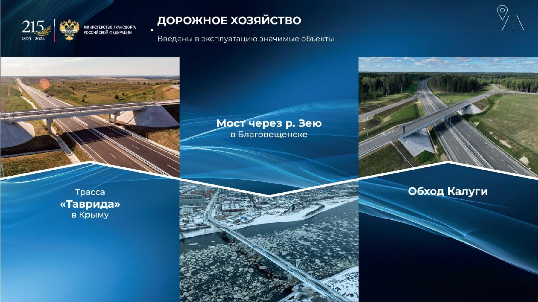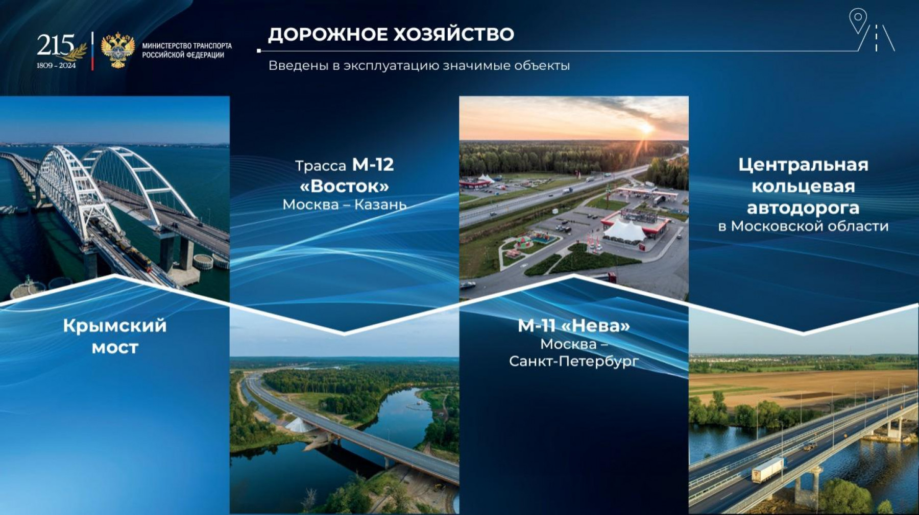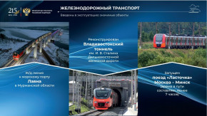 Открыты важнейшие объекты транспортной инфраструктуры: автомобильные дороги М-11 и М-12, Крымский мост, второй Байкальский и Керакский тоннели, Московские центральные диаметры, аэропорты в Новом Уренгое, Новосибирске, Владикавказе и других городах. Введены в эксплуатацию ледокол «Виктор Черномырдин», паромы «Маршал Рокоссовский» и «Генерал Черняховский». В регионах активно обновляется общественный транспорт, модернизируются пункты пропуска через государственную границу.