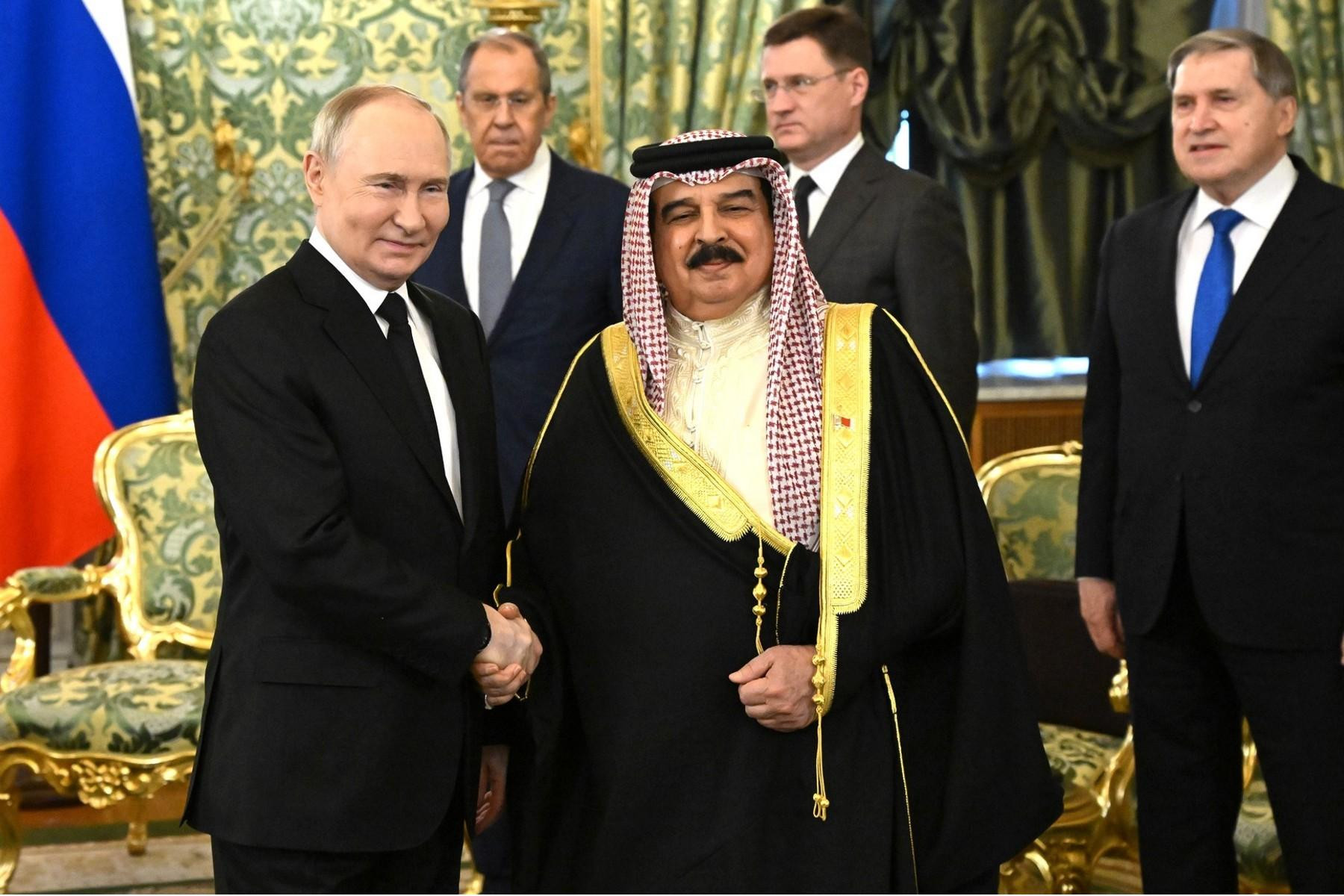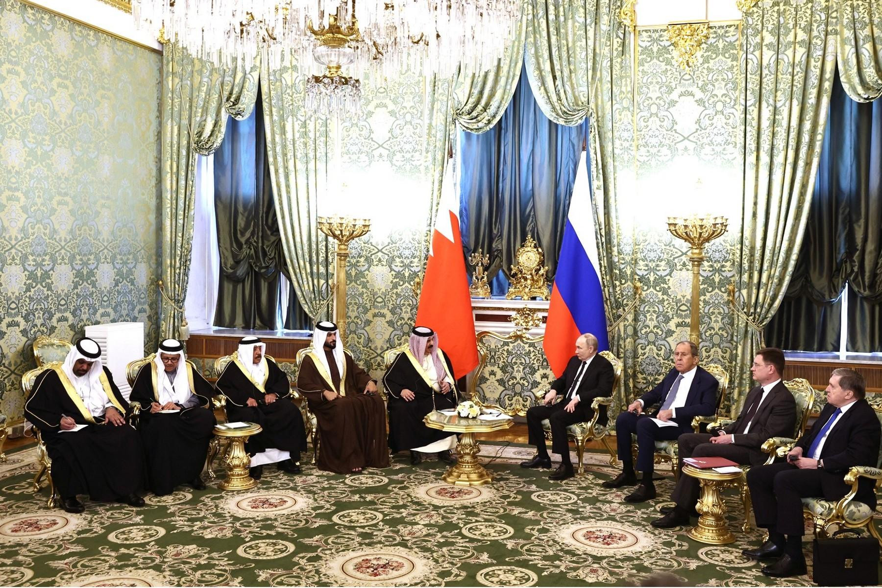 Сегодня Президент Российской Федерации Владимир Путин провел встречу с Королём Бахрейна Хамадом Бен Исой Аль Халифой. Главы государств обсудили вопросы сотрудничества в торгово-экономической, энергетической и гуманитарной областях, а также актуальные вопросы международной повестки дня.