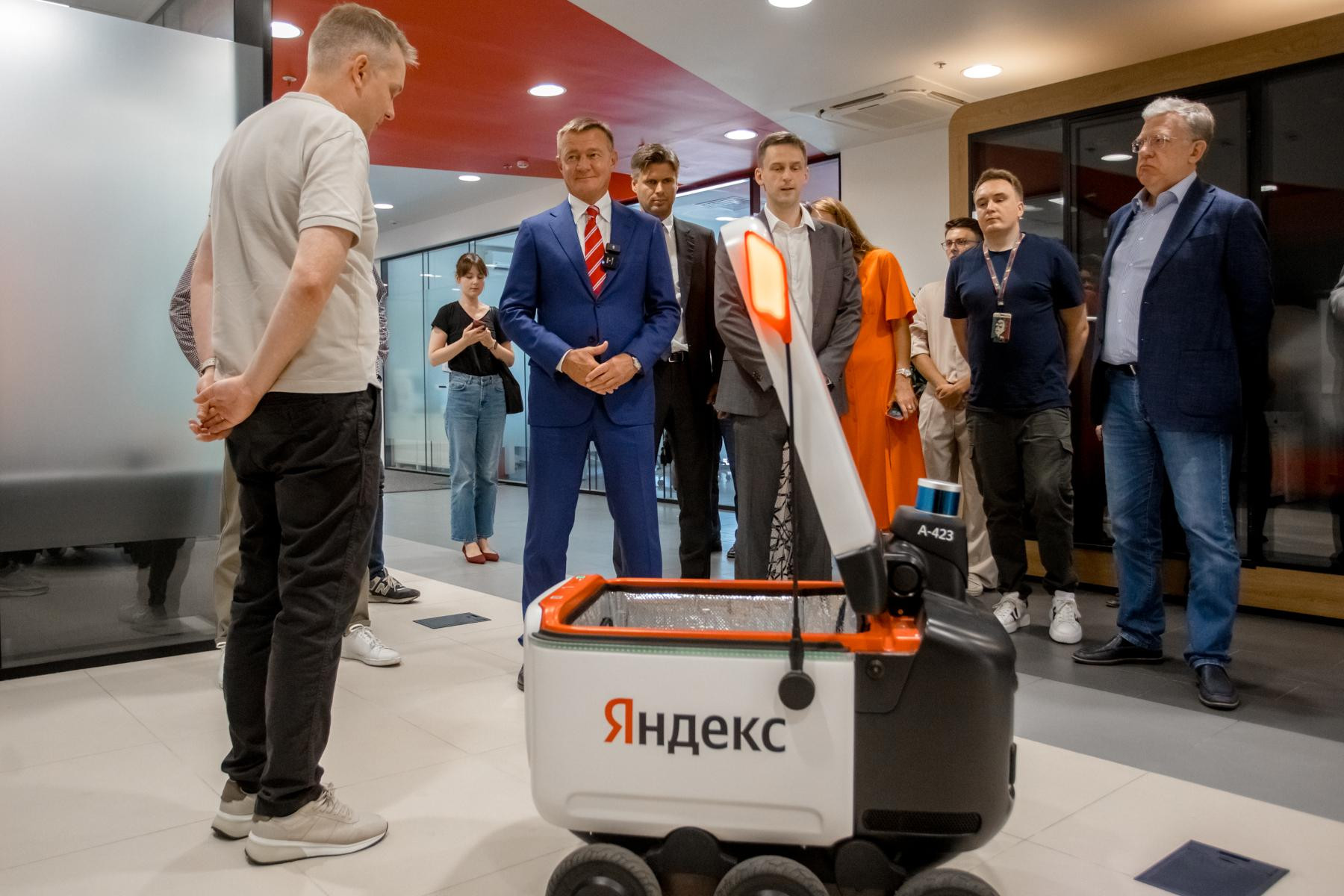 Кроме того, глава Минтранса ознакомился с работой робота-доставщика Яндекса и посетил цех сборки автономного транспорта.