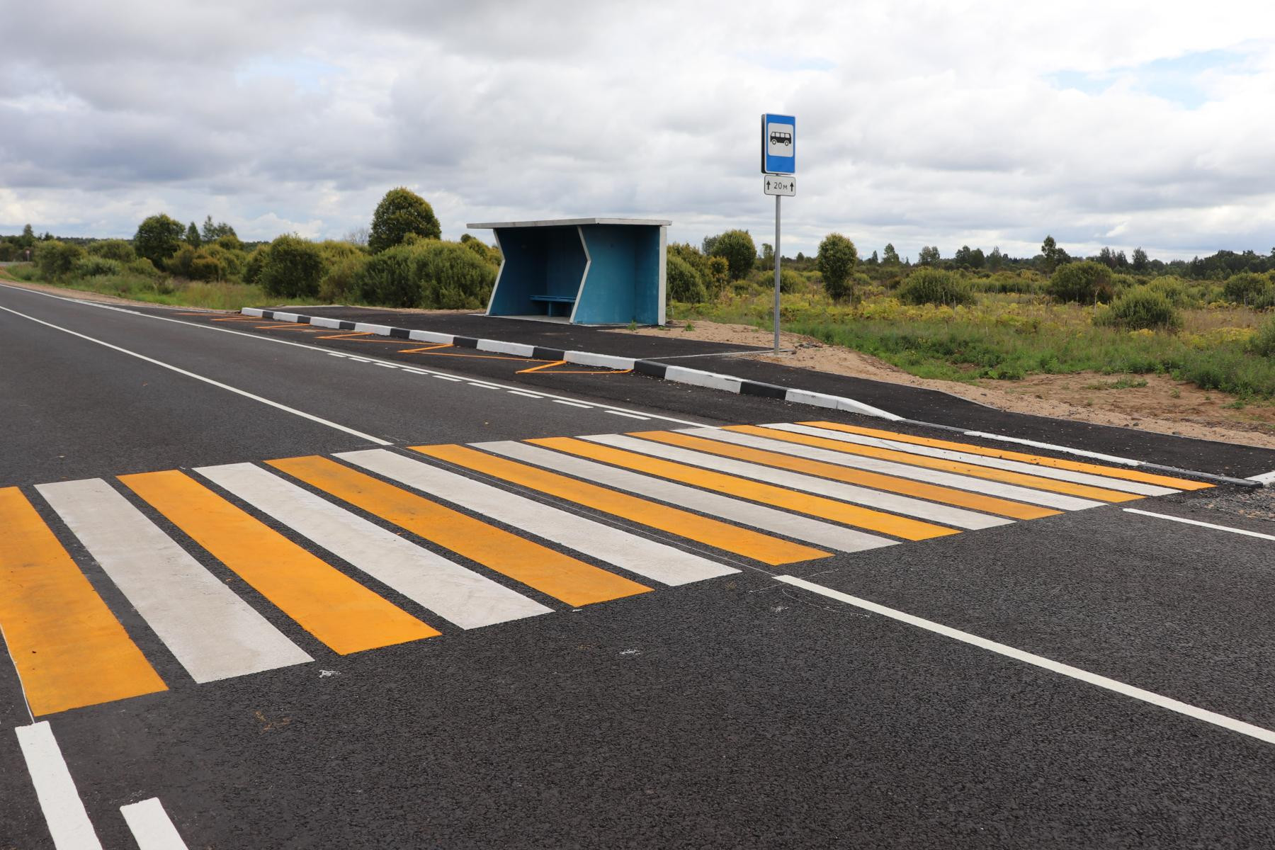 Для обеспечения безопасности движения на объекте установили металлические ограждения, разделяющие встречные потоки, краевые металлические ограждения на необходимых участках, а также дорожные знаки и светофоры. Кроме того, специалисты обустроили остановочные пункты, освещение в зоне пешеходных переходов и тротуары, нанесли разметку из термопластика.