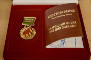 Нагрудный знак «Народный фронт. Всё для Победы» учрежден по поручению Президента России после встречи с участниками форума «Всё для Победы!». Наградой поощряются граждане, принимающие активное участие в волонтерской деятельности по оказанию помощи участникам специальной военной операции и членам их семей.