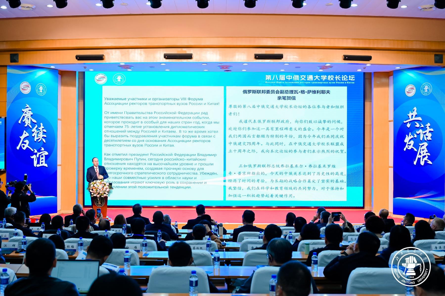Замглавы Минтранса озвучил обращение к участникам Форума от имени заместителя Председателя Правительства РФ Виталия Савельева. «Ассоциация ректоров транспортных вузов России и Китая на протяжении десяти лет объединяет ведущие образовательные учреждения, создавая уникальные возможности для обмена знаниями и опытом, а также для укрепления взаимопонимания между нашими народами. Это сотрудничество служит залогом не только повышения профессионального уровня выпускников, но и укрепления гуманитарных связей между Россией и Китаем», – отмечено в обращении. Заместитель Председателя Правительства выразил уверенность, что дискуссии Форума дадут новый импульс научно-техническому сотрудничеству и укреплению академических связей, послужит дальнейшему развитию транспортной отрасли и экономик двух стран.