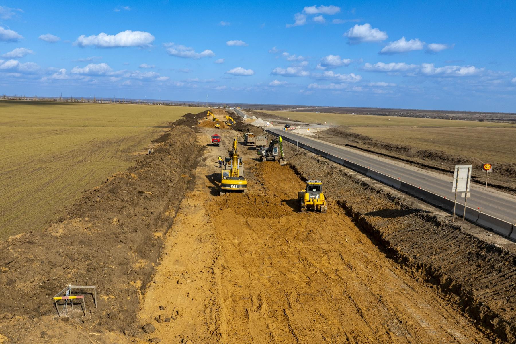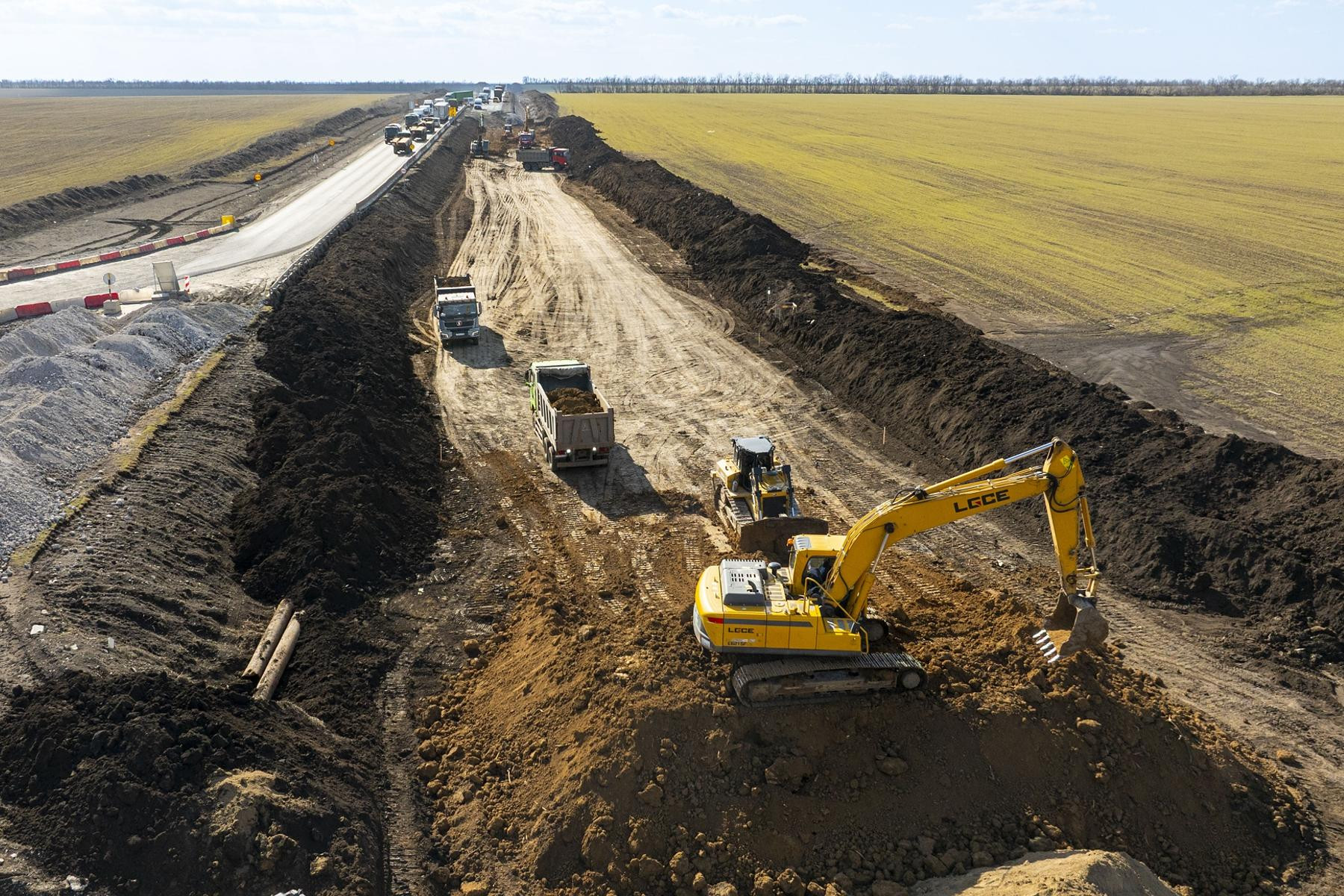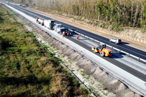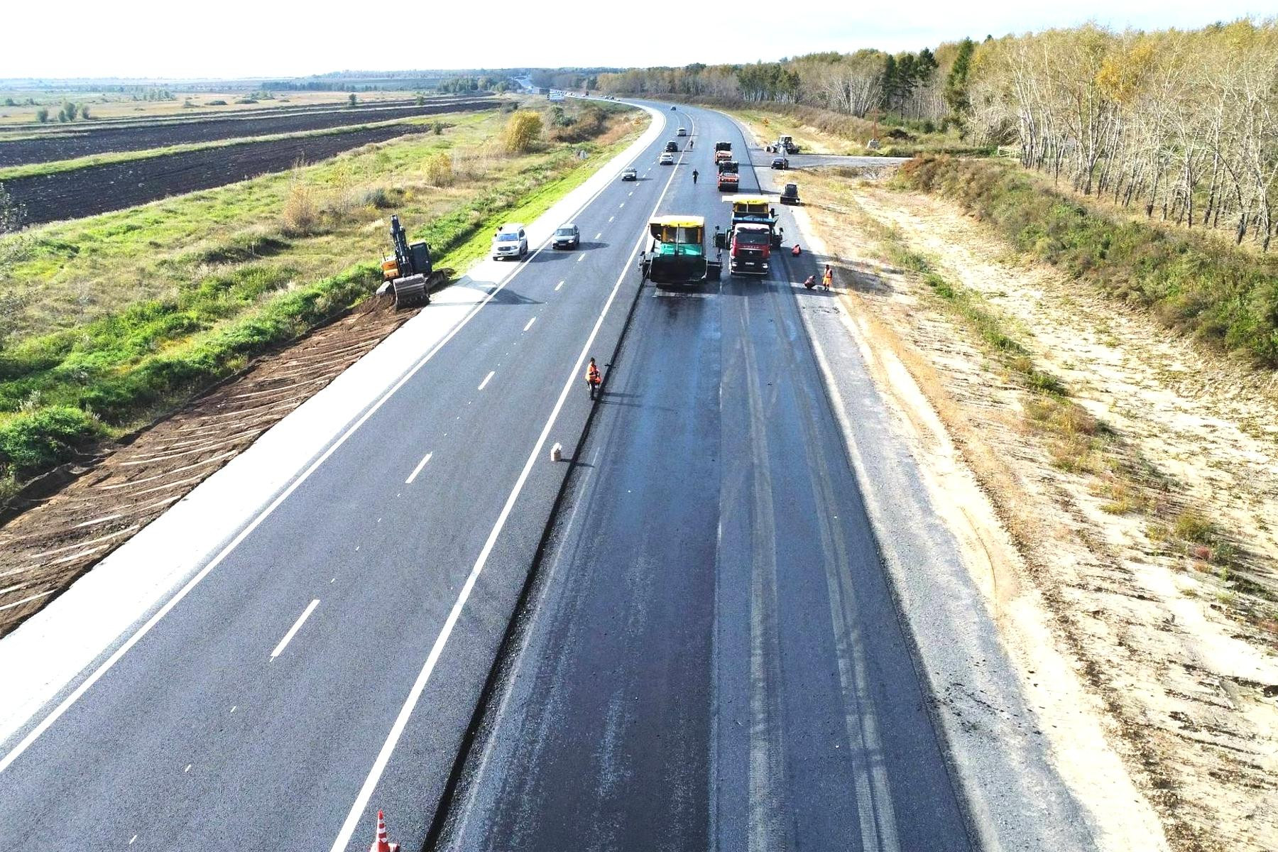 Дорожники уже завершили подготовительный этап и приступили устройству основного хода дороги. Также на отдельных участках ведется укладка асфальтобетонных слоев дорожной одежды будущей четырехполосной дороги.