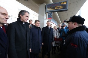 Почетные гости осмотрели инфраструктуру состава, заслушали рапорт начальника поезда о готовности к отправлению, и торжественно проводили поезд в первый рейс.
