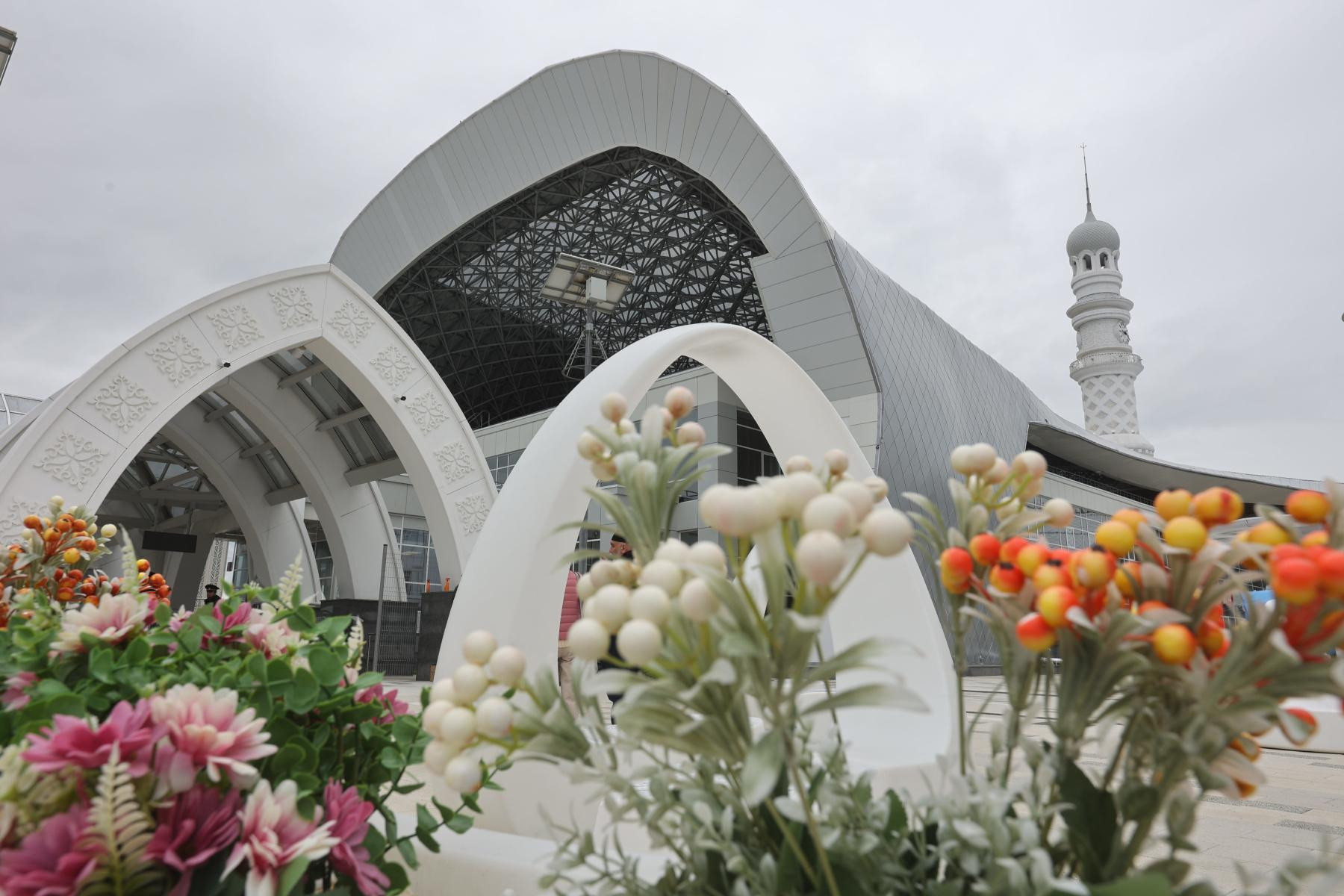 Вокзальный комплекс является уникальным с точки зрения реализованных планировочных и инженерных решений. Он органично вписывается в архитектурную концепцию города: сверху вокзал напоминает птицу с распростертыми крыльями, а основной его доминантой выступает величественная часовая башня высотой 67 метров, украшенная национальными узорами. Главный вход в здание подчеркивает центральная сводчатая арка навеса, плавно переходящая в боковые крылья, которые закрывают само здание вокзала, пешеходные зоны и места остановок городского транспорта, поэтому все пути передвижения пассажиров укрыты от осадков.