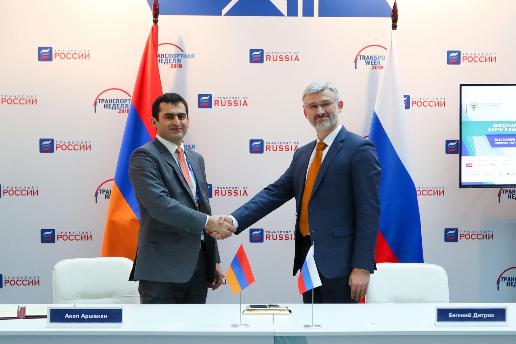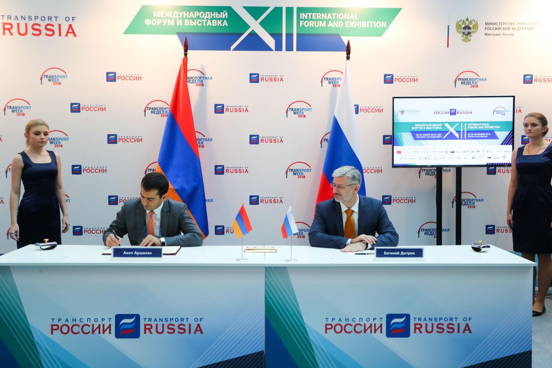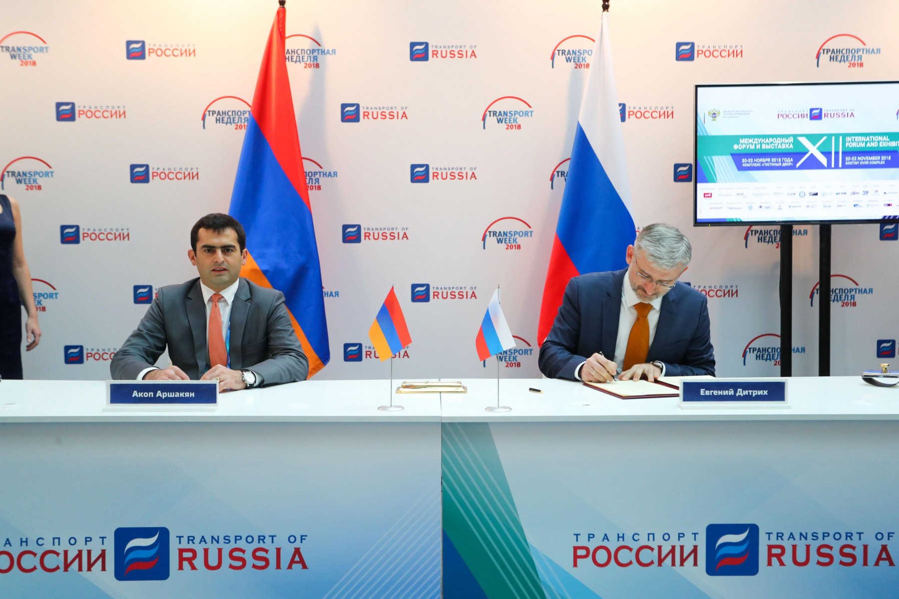 Подписи под документом поставили министр транспорта РФ Евгений Дитрих и и.о. министра транспорта, связи и информационных технологий Республики Армения Акоп Аршакян.