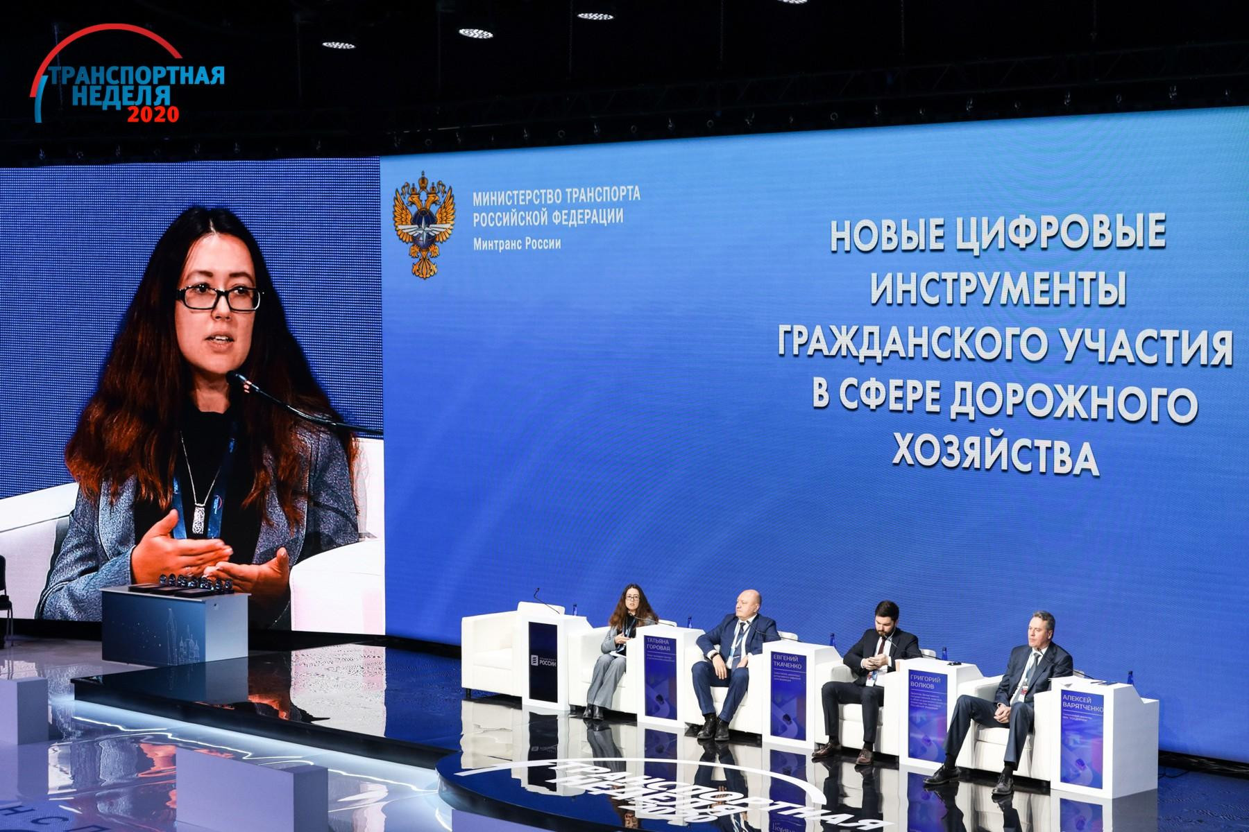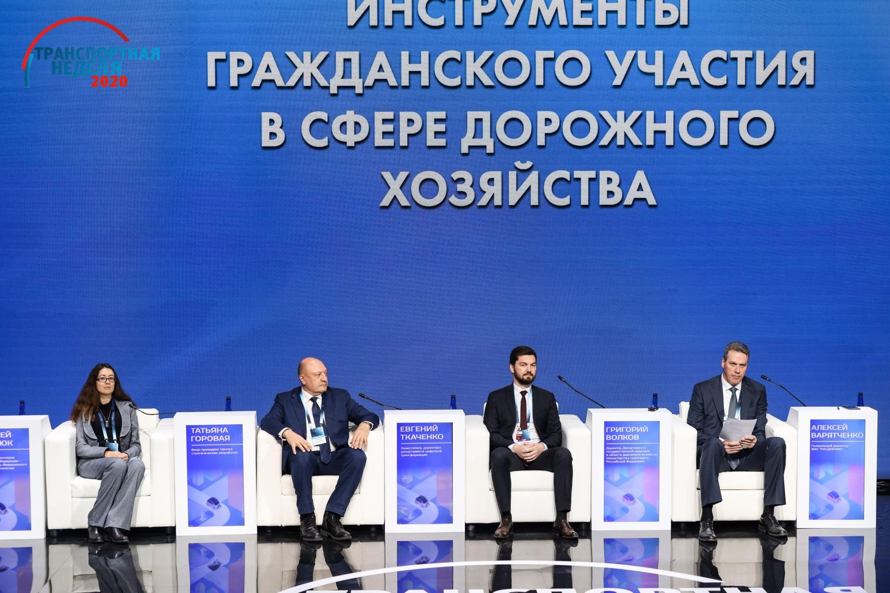 В рамках «Транспортной недели – 2020» прошла отраслевая конференция «Новые цифровые инструменты гражданского участия в сфере дорожного хозяйства». В ней приняли участие генеральный директор ФАУ «РОСДОРНИИ» Алексей Варятченко, директор Департамента государственной политики в области дорожного хозяйства Минтранса России Григорий Волков, заместитель директора Департамента цифровой трансформации Минтранса России Евгений Ткаченко и вице-президент Центра стратегических разработок Татьяна Горовая. По видеоконференцсвязи подключилась руководитель Центра городских компетенций АНО Агентства стратегических инициатив (АСИ) Татьяна Журавлева.